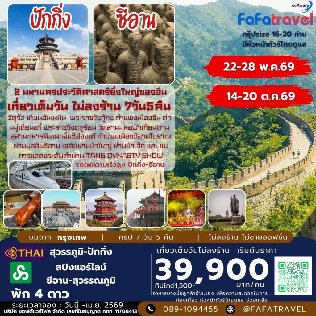 #ฟาฟาทราเวล #ทัวร์จีน #ปักกิ่งซีอาน #ทัวร์ปักกิ่ง #กำแพงเมืองจีน #พระราชวังต้องห้าม #ซีอาน #ทหารดินเผา #โชว์ราชวงศ์ถัง #เที่ยวจีนแบบพรีเมียม #เที่ยวไม่ลงร้าน #เที่ยวจีนคุ้มค่า #รถไฟความเร็วสูงจีน #BeijingXian #ทัวร์ไม่ลงร้าน #ทัวร์ดีมีคุณภาพ #เที่ยวกับฟาฟา