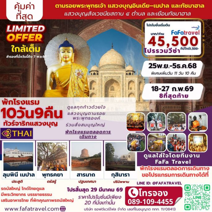 แสวงบุญอิ่มบุญ และ เที่ยวสนุก ครบทุกรสที่พักดี อาหารอร่อย ใส่ใจคุณภาพ ทริปแสวงบุญและท่องเที่ยวอินเดียแบบเต็มอิ่ม 10วัน9คืน การบินไทย พักโรงแรม เส้นทางสุดพิเศษ  พร้อมเดินทางแล้ววันนี้ด้วยราคาโปรโมชั่น