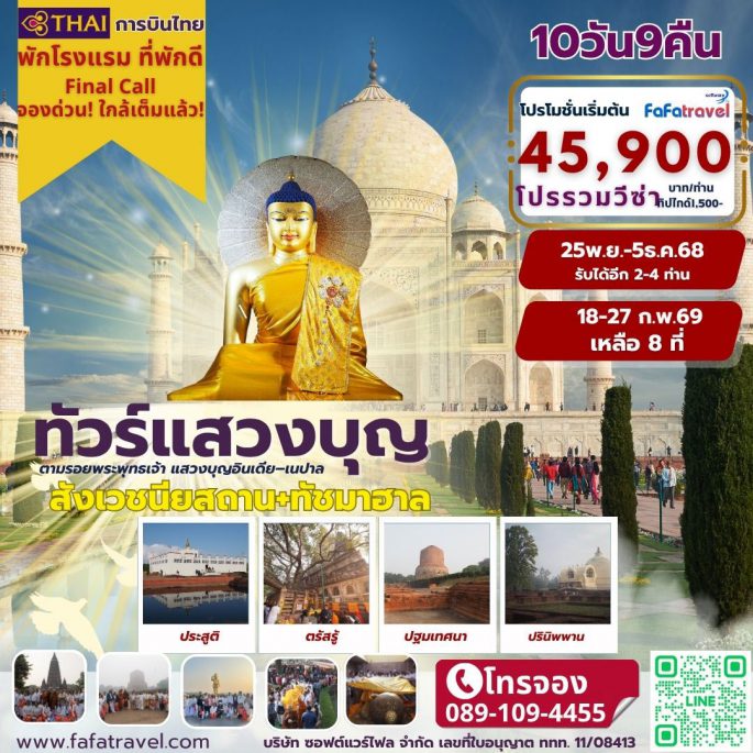 ร่วมเดินทางไปยังดินแดนแห่งพุทธภูมิ สัมผัสร่องรอยประวัติศาสตร์และจิตวิญญาณที่สืบทอดมากว่า 2,500 ปี พร้อมเยี่ยมชมสิ่งมหัศจรรย์ของโลก และสถานที่สำคัญทางพระพุทธศาสนาในอินเดียและเนปาล