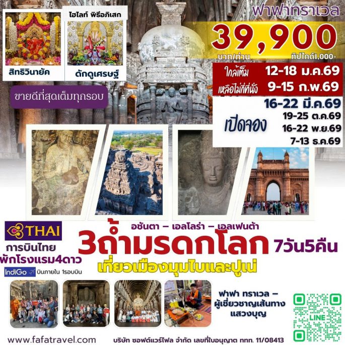 🌟 ทริปสุดคุ้มที่คุณไม่ควรพลาด! 🌟 พบกับการผจญภัยที่น่าตื่นตาตื่นใจใน #อินเดีย กับเรา! สำรวจ #ถ้ำอชันต้า, #ถ้ำเอลโรล่า, และ #ถ้ำเอลิฟินต้า ที่มีเสน่ห์มหัศจรรย์ พร้อมด้วยพิธี #มหาอภิเษกพระพิฆเนศ ที่ยิ่งใหญ่และตระการตา ⭐ขอพร องค์สิทธิวินายัก เป็นพระพิฆเนศ